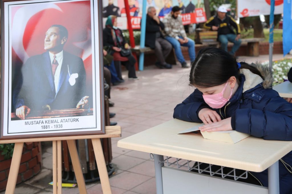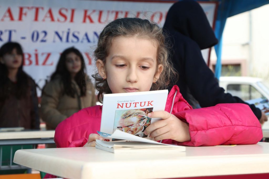 Öğrencilerle konuşan Efeler Belediye Başkanı Mehmet Fatih Atay, “Siz gelecekte ülkemizi yöneteceksiniz. Sizin bilgiyle büyümenizi çok önemsiyorum. Bunun için kitap kafeler açtık. Orada bugün size armağan ettiğimiz Ata’mızın değerli eseri gibi birbirinden güzel kitaplar sizi bekliyor” diyerek öğrencileri Kütüphane Haftası dolayısıyla kitap kafelere davet etti. Başkan Atay sözlerinin devamında, “Bu kitapta Büyük Atatürk verdiği o mücadeleyi ve yaptığı büyük işleri anlatıyor. Sizler de büyük insan olmak, başarılı işler yapmak istiyorsanız, lütfen bu kitabı okuyun ve arkadaşlarınıza da okutun” dedi.