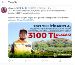 Aydın Büyükşehir Belediye Başkanı Özlem Çerçioğlu resmi Twitter hesabından yaptığı açıklamada; “2021 itibarıyla belediyemiz bünyesinde çalışan mesai arkadaşlarımızın ücretleri 3.100 TL olarak belirlenmiştir. Emekleri bizler için çok değerli olan çalışma arkadaşlarıma hayırlı olmasını diliyorum. #AsgariÜcret3100TL” ifadelerine yer verdi. SEMİH BAŞKAR