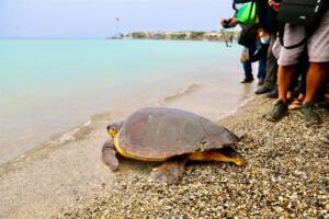 Deniz Kaplumbağaları Araştırma Kurtarma ve Rehabilitasyon Merkezi (DEKAMER) ve EKODOSD işbirliği ile 2 aylık tedavinin sürecinin ardından iyileşen Caretta Caretta Kaplumbağası bugün, Didim’in dünyaca ünlü Altınkum plajında gerçekleşen Didim Belediye Başkanı A.Deniz Atabay ile çok sayıda doğal hayat ve çevre dostu vatandaşların katılım gösterdiği törenle doğal yaşam alanına, denize bırakıldı.