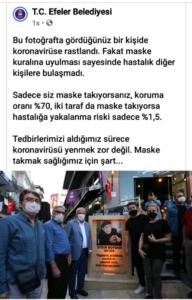 Efeler Belediyesi sosyal medya hesaplarından yapılan paylaşım ile maskenin koruyuculuğuna dikkat çekti. Açılıştan bir fotoğrafın paylaşıldığı gönderide, ‘’Bu fotoğrafta gördüğünüz bir kişide koronavirüse rastlandı. Fakat maske kuralına uyulması sayesinde hastalık diğer kişilere bulaşmadı. Sadece siz maske takıyorsanız, koruma oranı %70, iki taraf da maske takıyorsa hastalığa yakalanma riski sadece %1,5. Tedbirlerimizi aldığımız sürece koronavirüsü yenmek zor değil. Maske takmak sağlığımız için şart…’’ ifadelerine yer verildi. HABER MERKEZİ