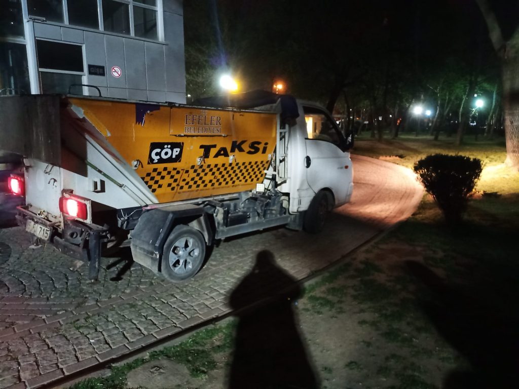 Dedim ki; yaparsa Fatih Başkanım yapar. Gerçekten de Aydın’a yakışır bir yer oldu. Her gün temizleniyor burası dedim. Saat de baya ilerledi kalkalım artık dedik. Bu arada bir tane Çöp Taksi yanaştı yanımıza. İçinden iki tane personel indi. Elinde siyah bir poşet diğerini elinde süpürge faraş çöpleri temizliyor.